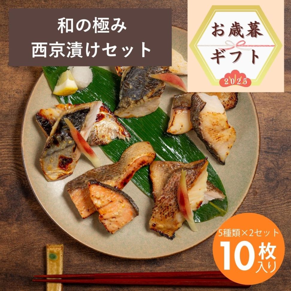 【お中元ギフト2025】和の極み 心斎橋紡生の西京焼きは、5種類(鮭、銀だら、鯖、鰆、メバル)×2セットで、合計10枚入です。