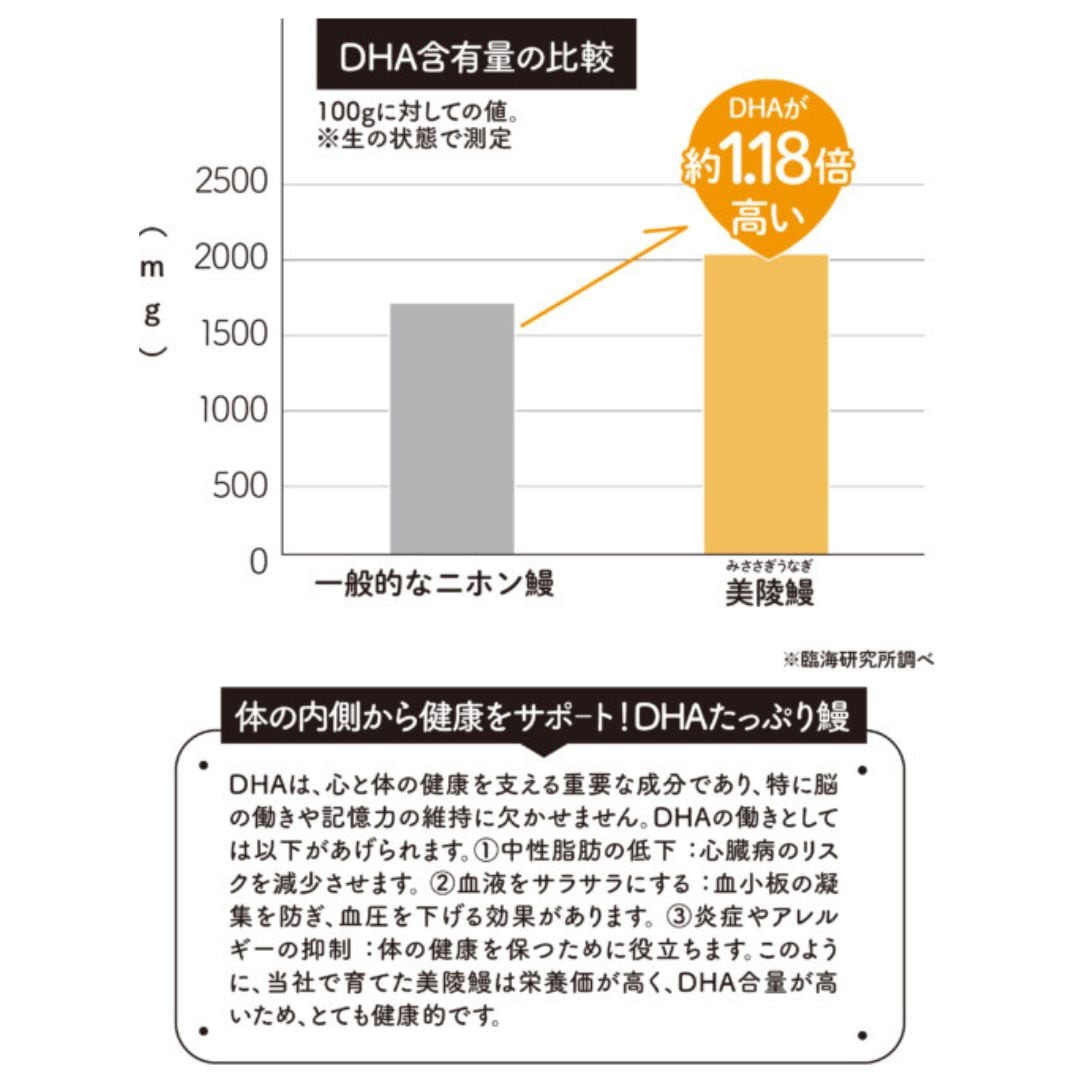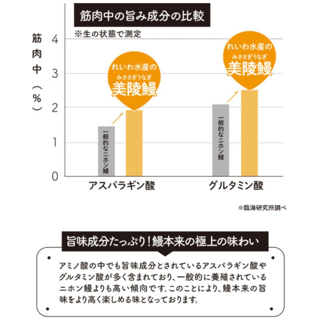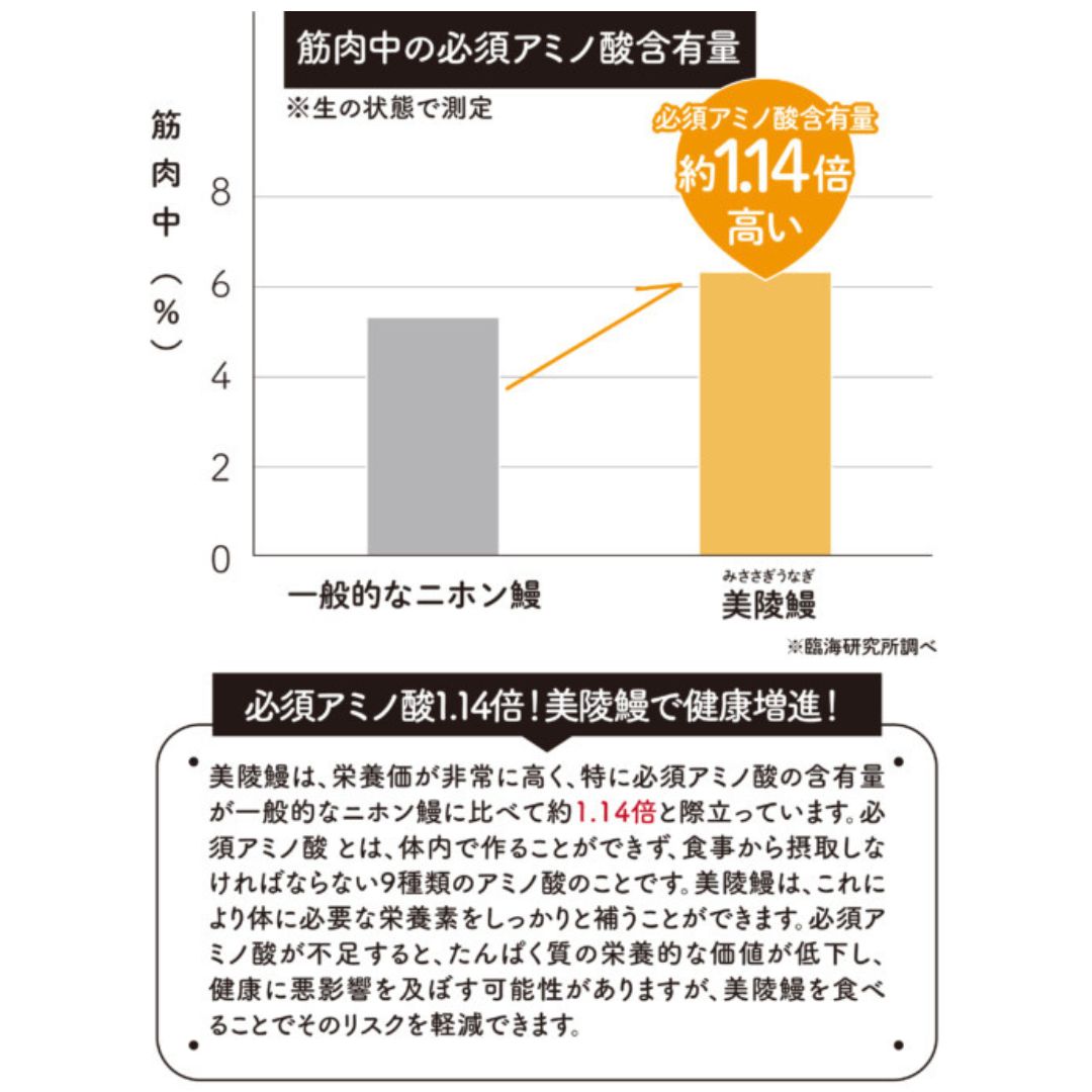 | 原材料 | うなぎ(国産)、清酒(米、米麹)、醤油(大豆・小麦を含む)、 みりん(もち米、醸造アルコール)、エリスリトール、きび糖 |